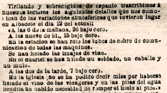 Esas gélidas temperaturas se registraron el 12 de diciembre de aquel año, 1875. Unos días después se ampliaron las informaciones sobre los efectos de ese temporal. En el periódico vasco Irurac Bat se indicó que el termómetro cayó por debajo de esos 17 grados. "Tiritando y sobrecogidos de espanto transcribimos a nuestros lectores los angustiosos detalles que nos comunican de las variaciones atmosféricas que tuvieron lugar en Albacete", y a partir de ahí se señalaba que a las 6 de la mañana se habían alcanzado los 26 grados bajo cero y a las 9 de la mañana, 15 bajo cero.