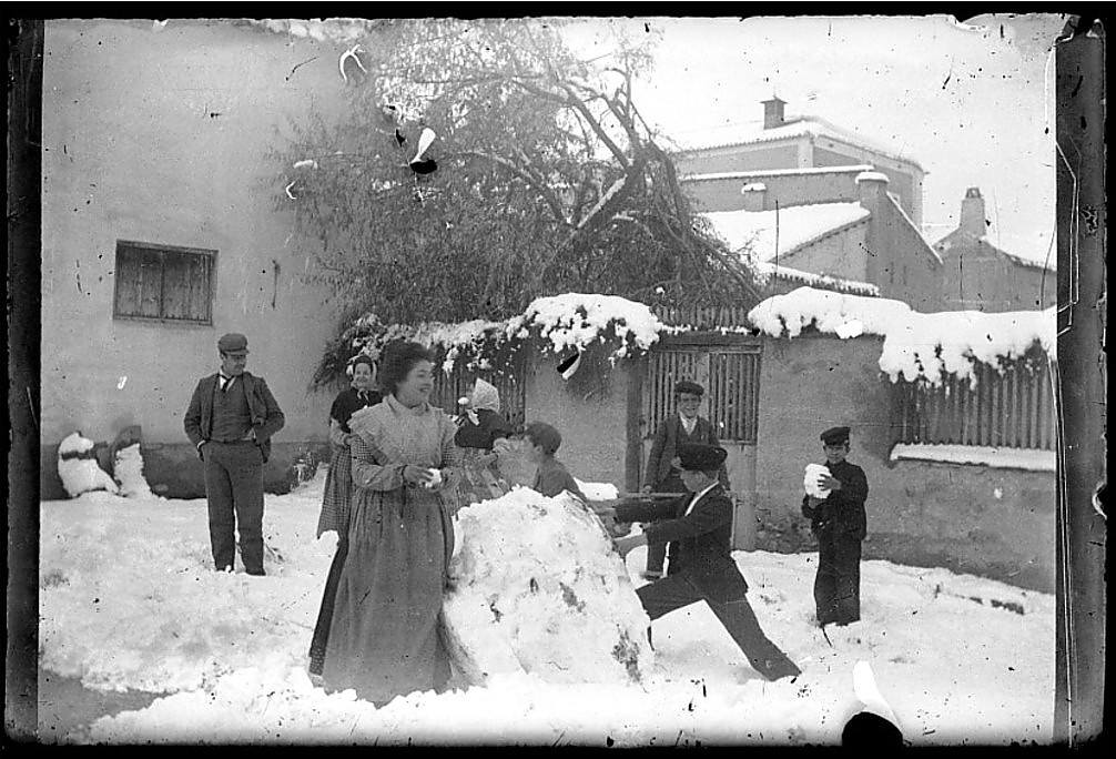Una familia juega en el patio de su casa tras una imponente nevada en torno al año 1910 en Albacete. / FOTO COLLADO
