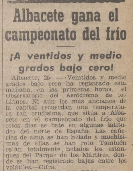 Otros titulares hablaban de que Albacete había ganado esos días el campeonato del frío, con los 23 grados bajo cero -menos algunas décimas- registrados en el Observatorio del entonces Aeródromo de Los Llanos. "Ni aun los más ancianos de la capital recuerdan una temperatura tan crudísima que sitúa a Albacete en el campeonato del frío que estos días se bate en algunas latitudes del norte de España. Las cañerías de agua se han helado y muchísimas de ellas se han roto. También están totalmente helados los estanques del parque de los Mártires - hoy, de Abelardo Sánchez-, donde se han registrado bajas entre los volátiles", informó la agencia de noticias Cifra.
