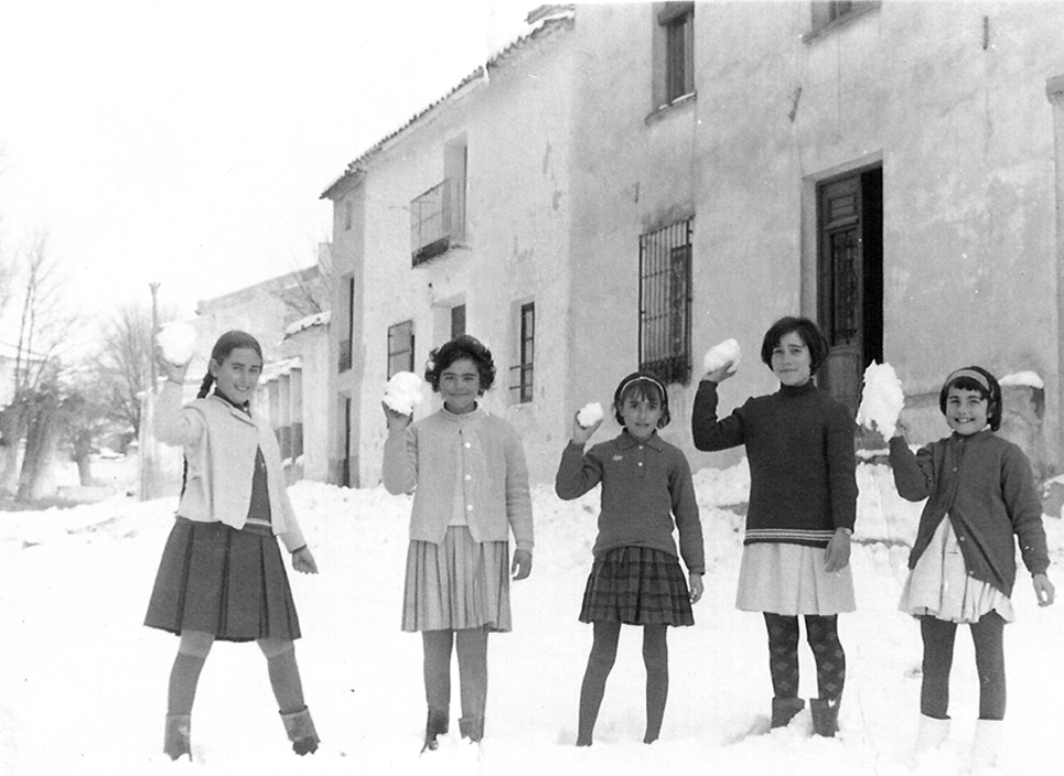 Recorte de prensa de 1944, cuando Albacete fue la capital más fría de España y grupo de niñas jugando con la nieve en la calle en Fuentealbilla (FONDO LOS LEGADOS DE LA TIERRA)