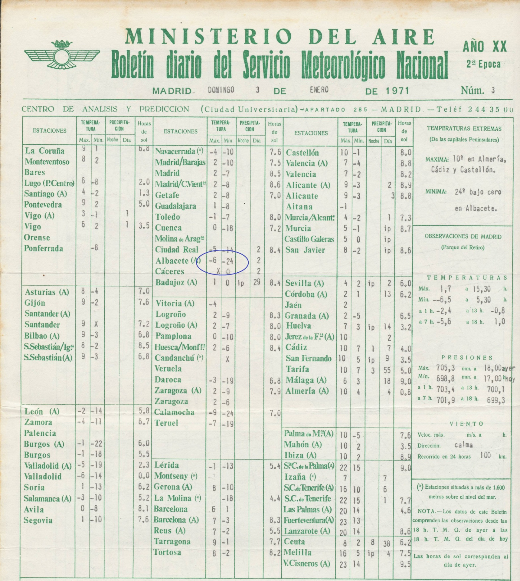 En las décadas posteriores este tipo de noticias se repitieron, pero ninguna como la que recorrió España en enero de 1971. El día 3 se alcanzaron los 24 grados bajo cero. Fue el punto final de un temporal que trajo hasta cinco nevadas consecutivas: "10 días de angustiosa lucha contra la nieve, el frío y el hielo", según La Voz de Albacete.