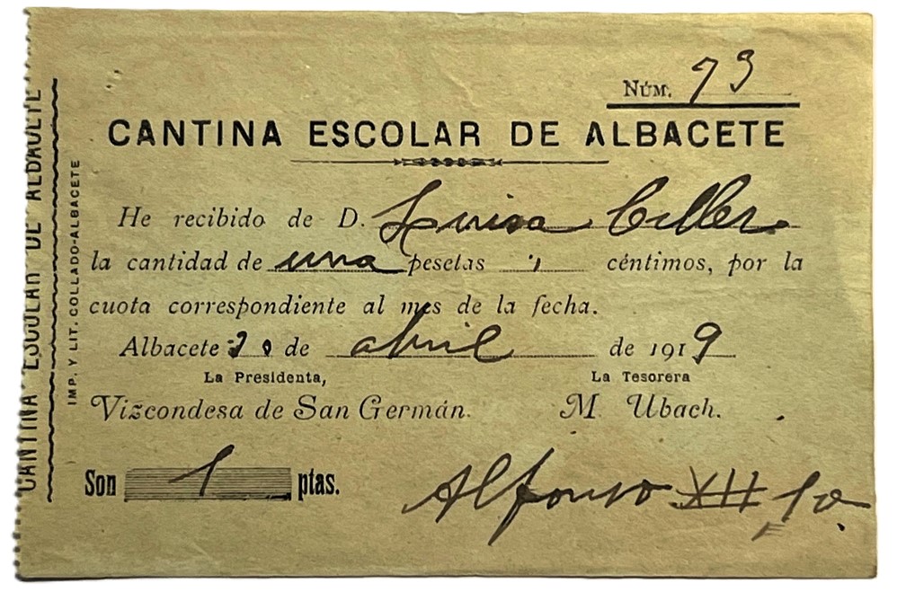 Recibo de donación a la Cantina Escolar, cárcel del Puente de Madera y Casa de la Misericordia. / DEL ALBACETE ANTIGUO Y DIPUALBA