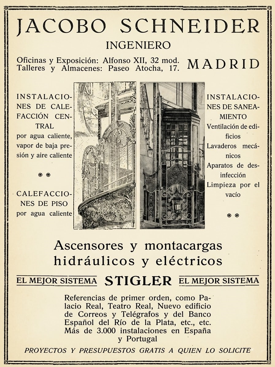 Pues bien, ese edificio también decidió colocar un ascensor. Y así lo atestiguan los anuncios que se publicaban en la prensa de profesionales y comerciantes instalados en esta bella construcción, dotada de una planta baja, un entresuelo, dos pisos principales, otro subsidiario o ático y un sobreático de servicio.
