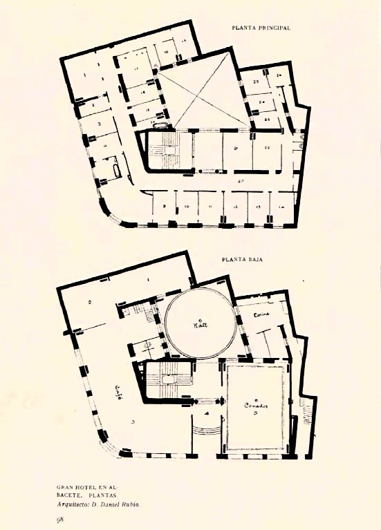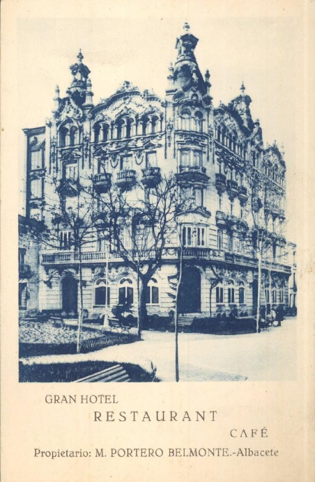 Del establecimiento albacetense destacaba que estaba dotado de 80 habitaciones con capacidad para 110 camas, aseos en todos los pisos, habitaciones con baño, ascensores, agua caliente y fría en todos los cuartos, calefacción constante, vestíbulo central suntuoso, cena y gran café en los bajos amenizada por una estupenda orquesta.