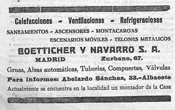En 1935 se instaló en Albacete una delegación de la prestigiosa empresa Boetticher y Navarro -Calefacciones / Ventilaciones / refrigeraciones / saneamientos / ascensores / montacargas / escenarios móviles / telones metálicos-, aunque su sede principal estaba en el número 67 de la calle Zurbano de Madrid, los albaceteños interesados en sus servicios debían acudir a la calle Abelardo Sánchez 33, donde la compañía disponía de su propio montador.