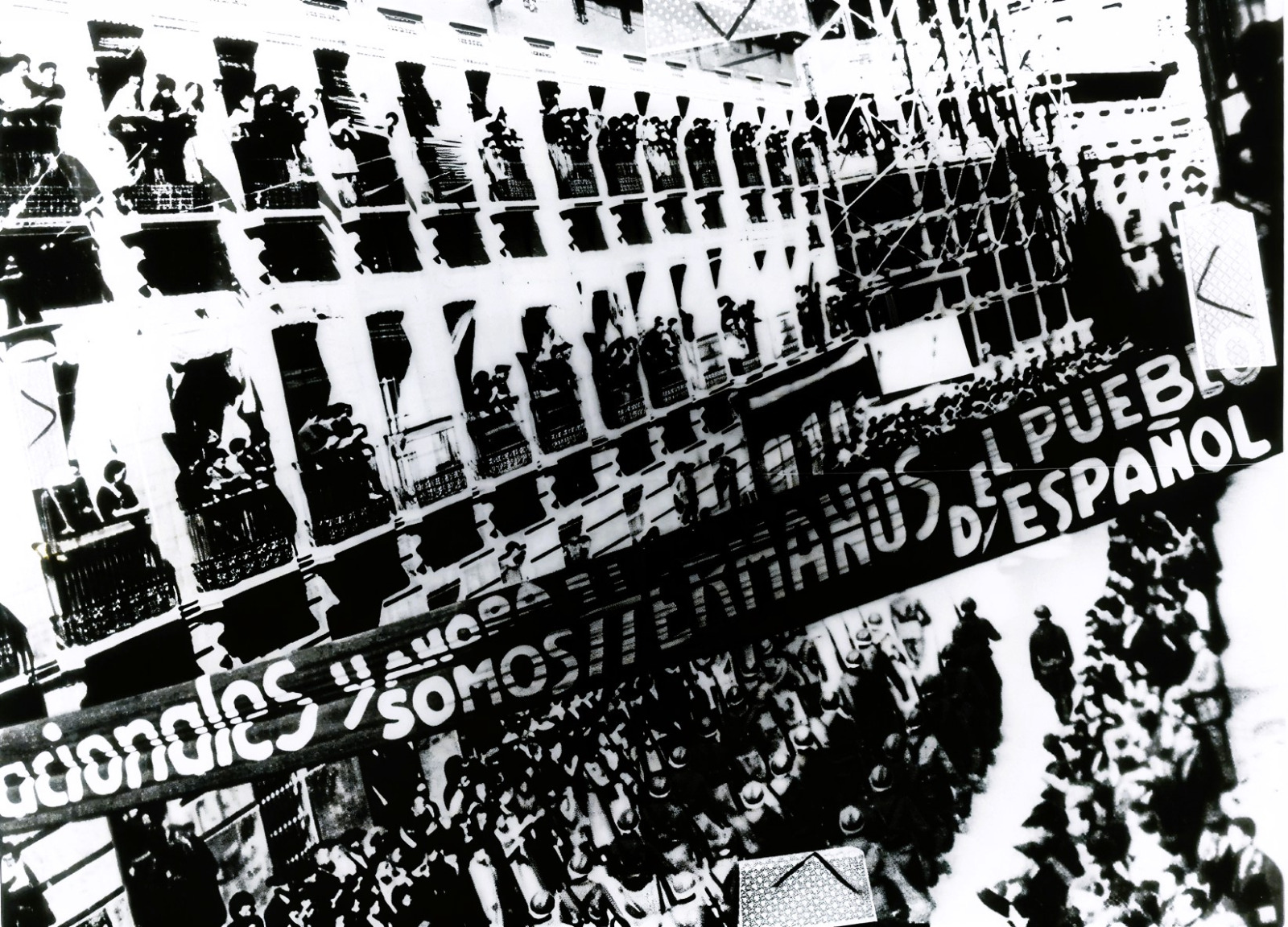 Las Brigadas Internacionales desfilan por la calle Ancha. Al fondo de la imagen se puede comprobar que el edificio Legorburo no está terminado. / Cedobi