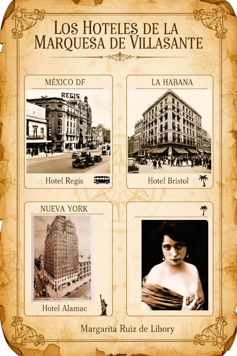 Hoteles d los que hizo su casa la marquesa de Villasante, Margarita Ruiz de Lihory, en su periplo americano. En México Distrito Federal, Hotel Regis; en La Habana, Hotel Bristol, y en Nueva York, Hotel Alamac.